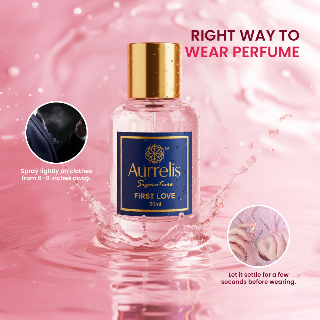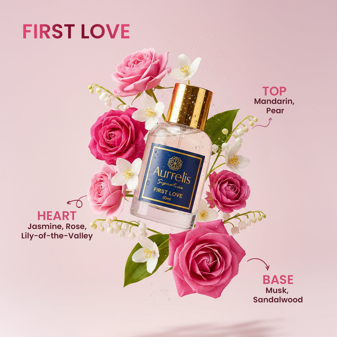 First Love evokes the tenderness of romance with radiant mandarin, peach, and bergamot. At its heart blooms a bouquet of jasmine, rose, orchid, and lily of the valley, settling into a soft embrace of cedarwood, musk, and vanilla. Graceful and timeless, it’s the fragrance of cherished moments.