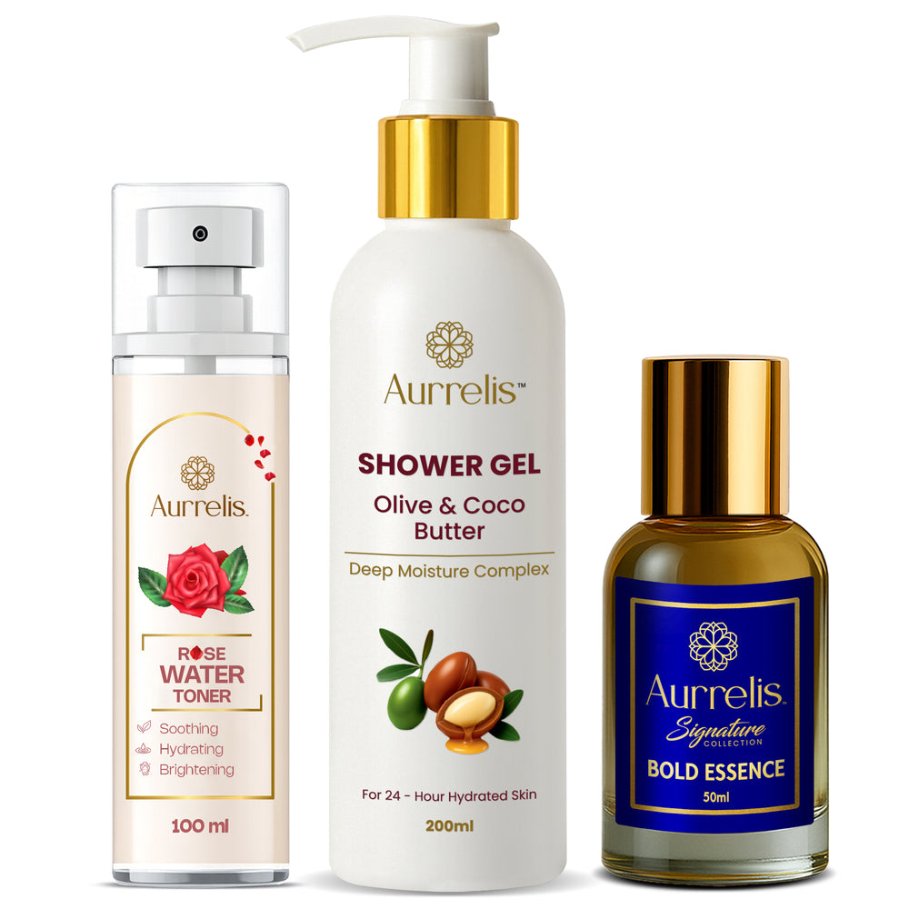 A power-packed grooming combo crafted for those who like their routine clean, nourishing, and confidently bold. This trio brings together a richly moisturizing shower gel, a refreshing toner, and a long-lasting extrait perfume for a complete cleanse–tone–fragrance ritual that stands out.