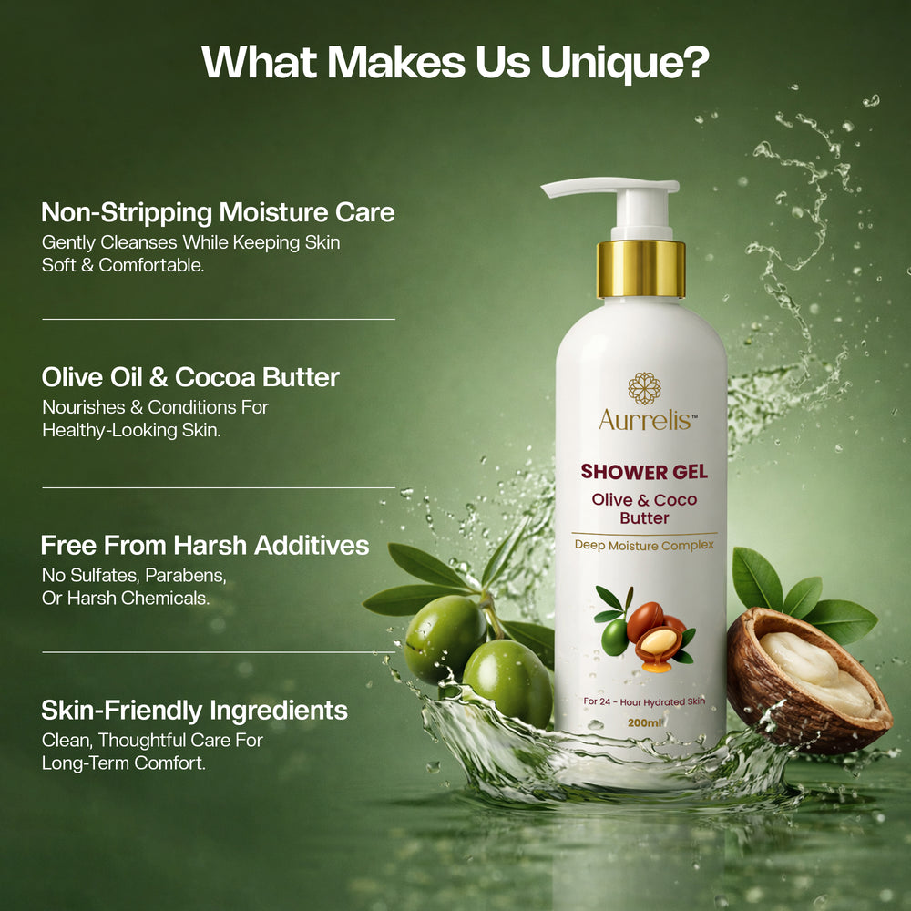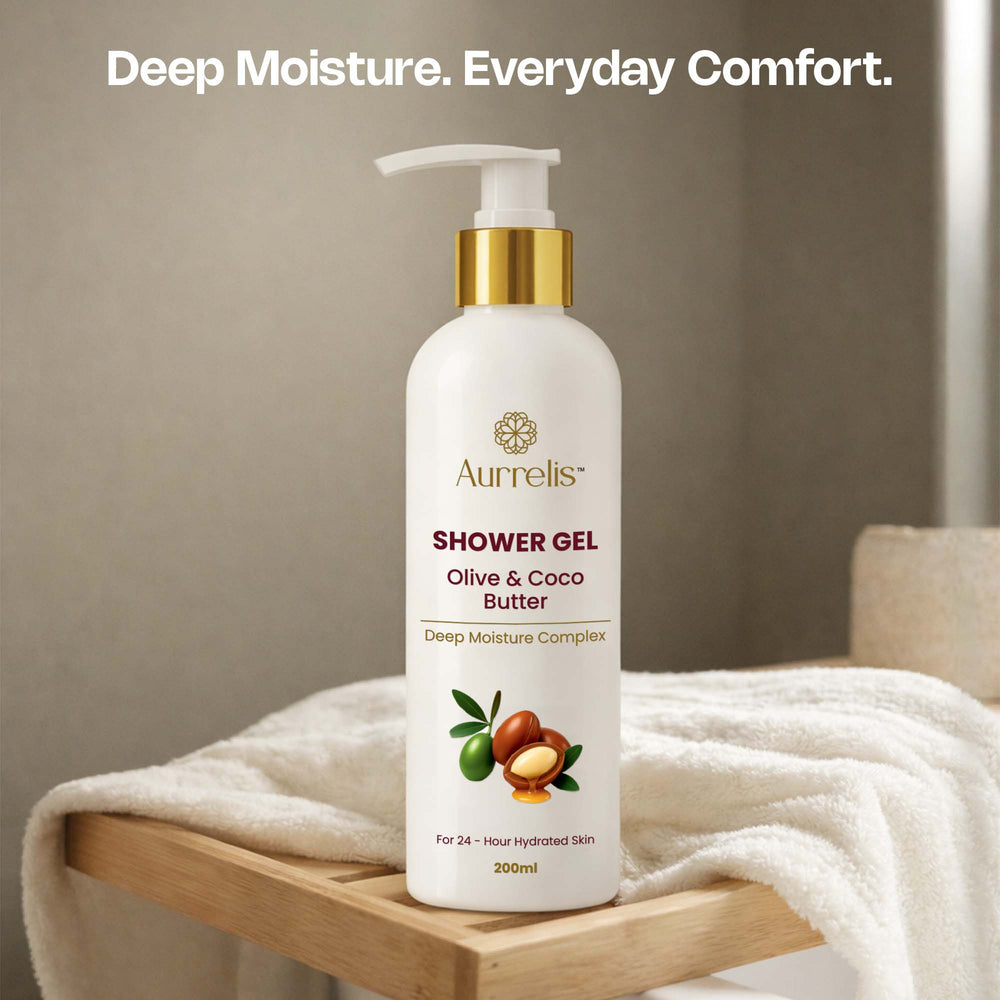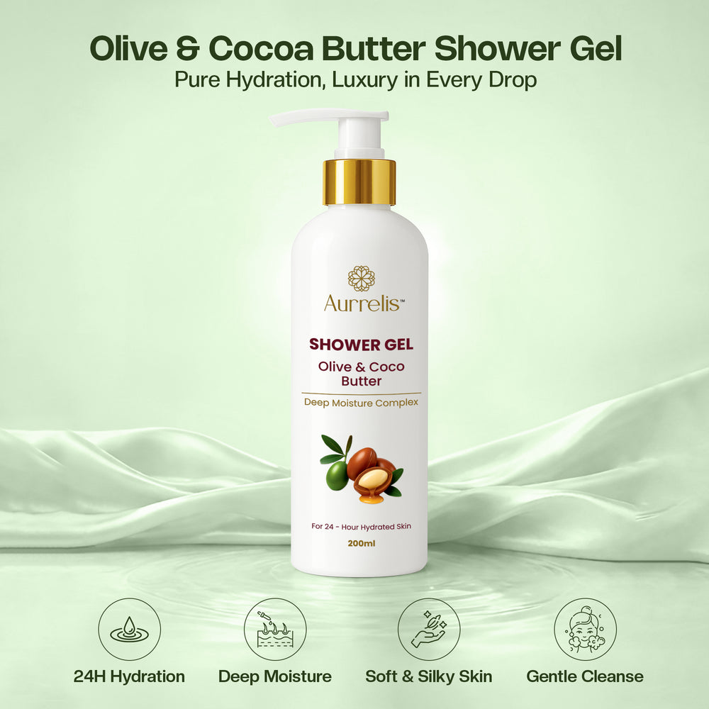 Indulge in everyday nourishment with Aurrelis Olive & Coco Butter Shower Gel, a luxurious body wash crafted to cleanse while deeply moisturizing the skin. Enriched with olive oil and cocoa butter, its creamy, rich lather gently removes impurities without stripping natural moisture. Designed to elevate your daily bathing ritual, this shower gel leaves skin feeling soft, smooth, hydrated, and refreshed with a subtle, long-lasting fragrance.