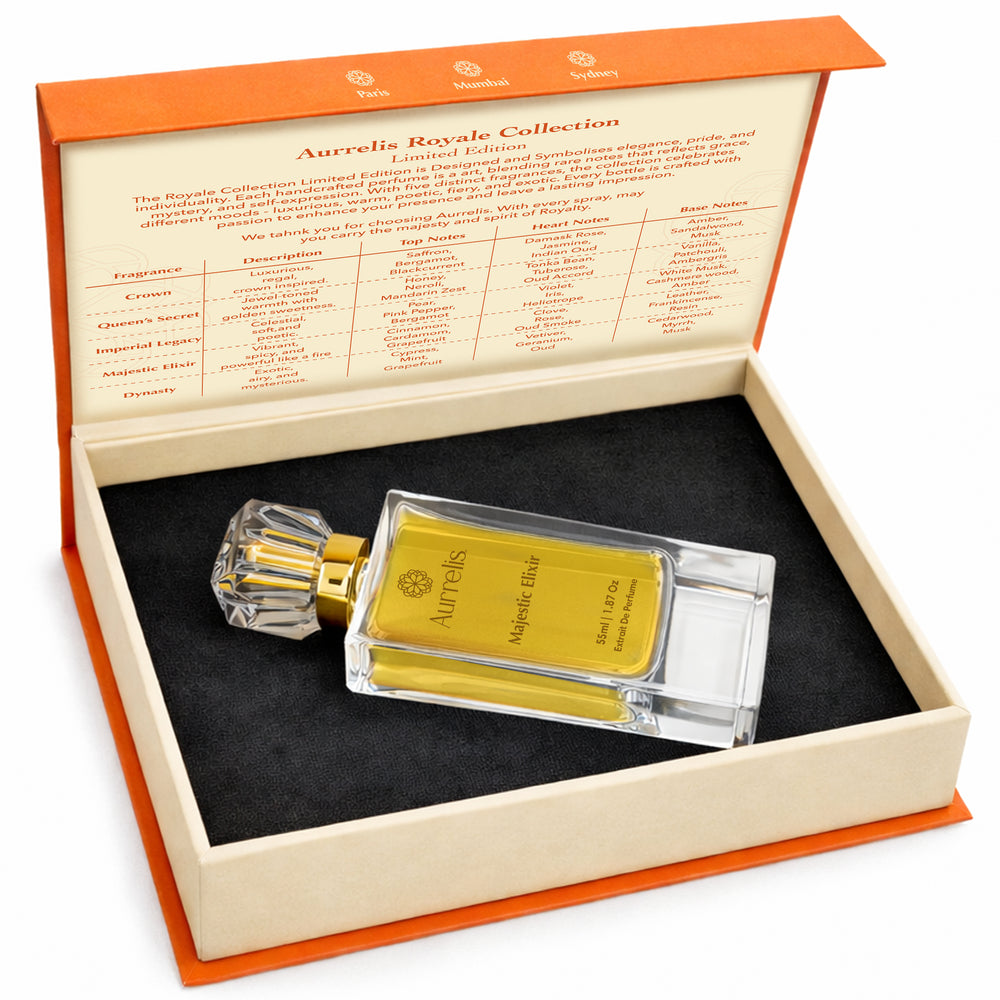 Aurrelis Majestic Elixir is a fragrance born from shadows, luxury, and mystery. This extrait de parfum opens with an intoxicating blend of Rose Noir, smoked petals, and dark blackcurrant—sensual, exotic, and instantly captivating. As it deepens, the heart reveals rich oud trails, leather resin, and dried plum, creating a dark, velvety core full of intrigue and allure. The base burns slowly with incense wood, dark patchouli, and amber tar, forming a smoky, lingering trail that feels magnetic and hypnotic.