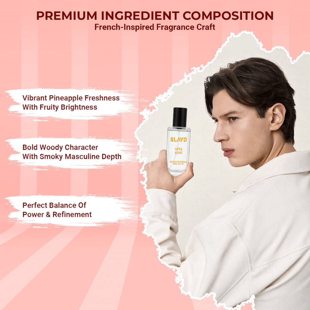 Apex King is bold energy bottled for the modern man. Opening with a juicy hit of pineapple, this extrait de parfum feels instantly fresh, confident, and attention-grabbing. As it settles, smoky birch takes over—adding that rugged, masculine depth that feels powerful without trying too hard. The dry-down of earthy oakmoss grounds it all, creating a rich woody-fruity signature that lasts from morning hustle to late-night plans.
