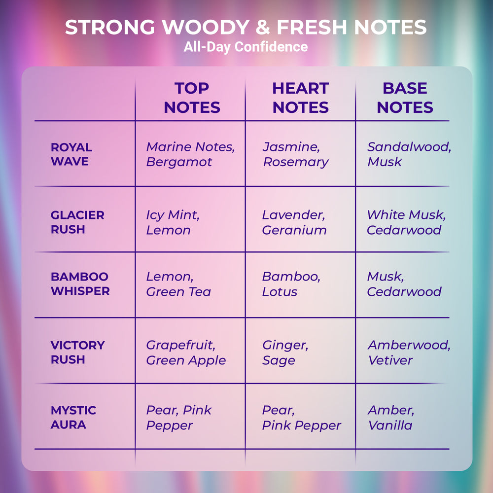 The Everyday Luxury Set is designed for effortless sophistication and all-day comfort. This unisex fragrance collection brings together five clean, modern, and long-lasting scents—Royal Wave, Glacier Rush, Bamboo Whisper, Victory Rush, and Mystic Aura. Each fragrance is crafted to feel fresh, refined, and easy to wear, making this set perfect for daily routines, workdays, travel, and relaxed evenings. Balanced, versatile, and quietly luxurious, this premium pack of five delivers everyday elegance without trying too hard.