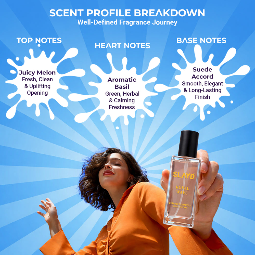 Royal Wave is fresh sophistication with a modern edge. Clean, smooth, and effortlessly stylish, this extrait de parfum opens with juicy melon freshness that feels instantly uplifting. As it settles, aromatic basil adds a green, calming confidence, while the suede base brings a soft, elegant, slightly leathery finish that feels refined and cool. Easy to wear and endlessly versatile, Royal Wave is your everyday pocket perfume for clean energy, subtle luxury, and effortless confidence.