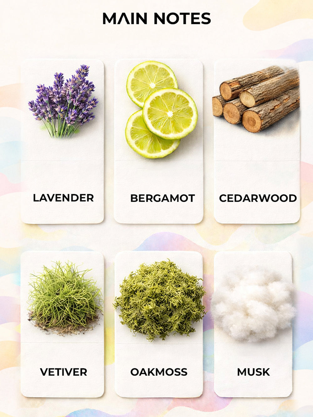 • Fresh lavender opening balanced by cedar woodiness and oakmoss depth